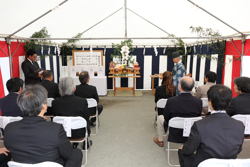 米原駅東口前の土地に建設する新社屋の設計を進めてまいりましたが、この度、2015年10月6日、建設予定地(米原市梅が原2462番)にて地鎮祭も取り行い、いよいよ無事に着工の日を迎えることとなりました。